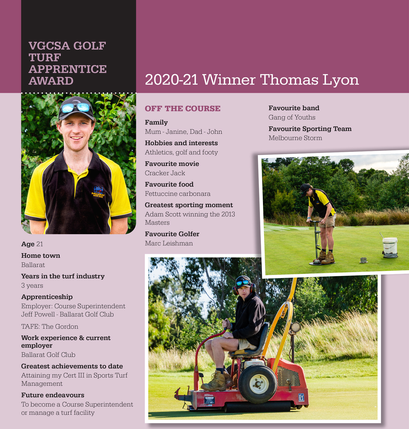 Congratulations to Tom Lyon on taking out the VGCSA Golf Turf Apprentice Award