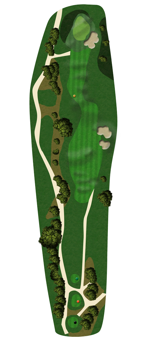 Slightly uphill 359 metre par 4, (331 from the Middle tee and 305 from the Forward tee), which has fairway bunkering at 220 metres on the right. On the right of the fairway there are existing Pine trees, which were kept to discourage tee shots fading towards the 14th fairway.