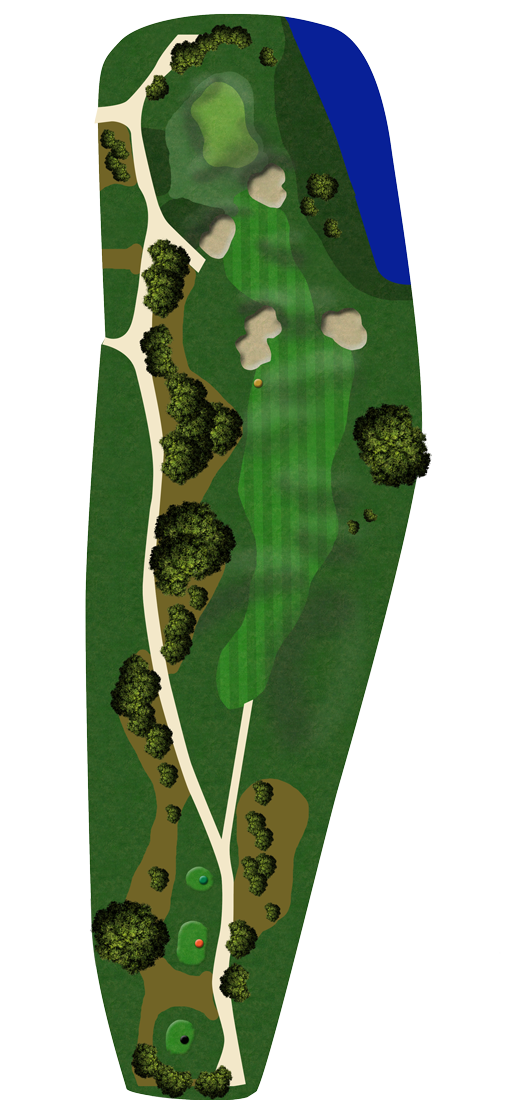 A gentle ridge extends from the dam wall across the centre of the green, which has a greenside bunker front right and a deep swale back right. Conservative play is the best option, laying up short of the fairway bunkers leaving a full shot into the green, making sure you get your second shot close to the hole, as the green has many undulations.